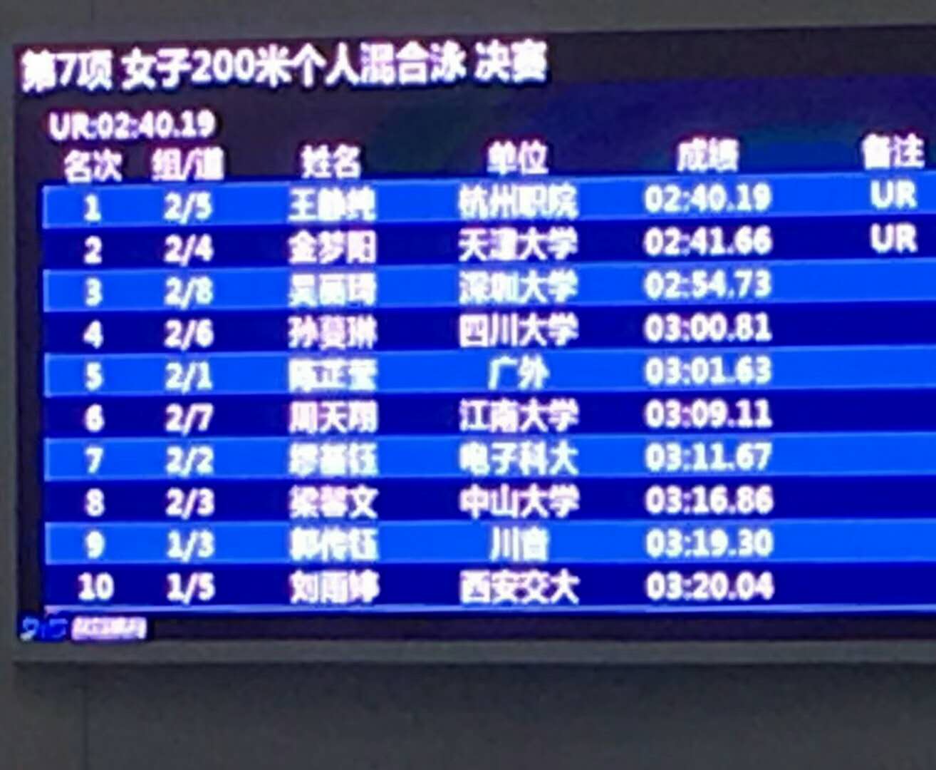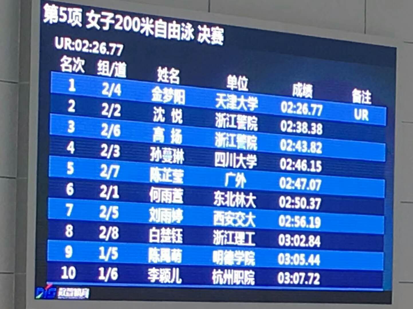 本站讯(通讯员刘铁刚)2018年中国大学生阳光体育游泳比赛在经过3天共六场次的激烈角逐后,于7月21日在浙江省苍南县体育中心游泳馆落下帷幕。我校游泳队派出金梦阳同学代表学校参赛,在参赛的两个项目中双双打破已保持4年的阳光组全国纪录,获得女子200m自由泳金牌和200m混合泳银牌,实现了我校普通生全国最高级别赛事成绩的历史性突破。