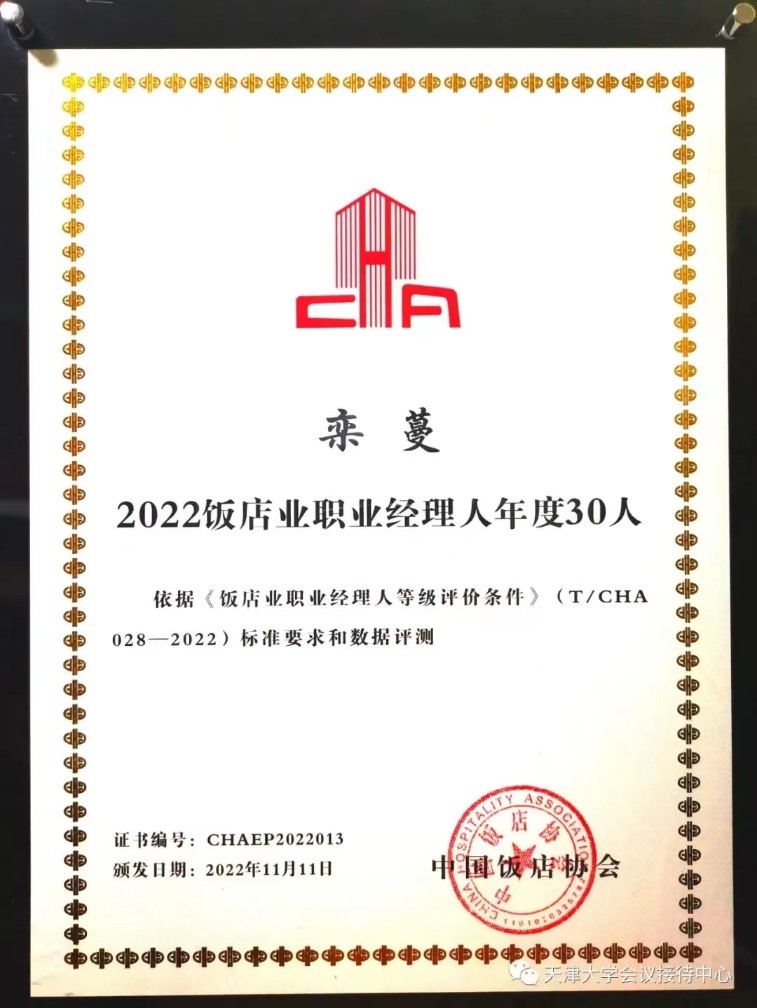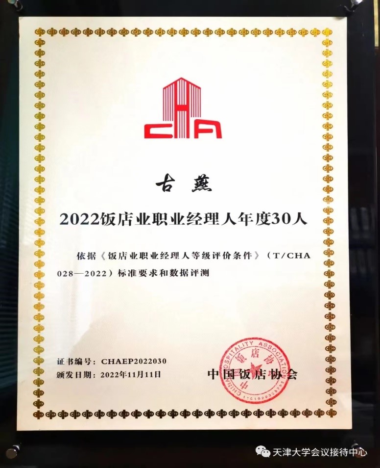 天津大学会议接待中心在此次大会中荣获“2022中国酒店品质服务TOP100”殊荣,中心总经理栾蔓被特聘为“中国饭店协会职业经理人专业委员会副理事长”并被授予“2022饭店业职业经理人年度30人”,副总经理古燕被授予“2022饭店业职业经理人年度30人”。