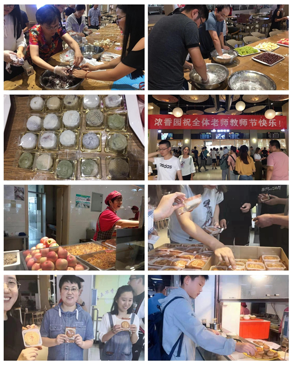 中秋节当天,食堂在售饭窗口和大厅安排了专人为师生发放免费月饼,共计发放3400块。中秋前夕,浓香园食堂还配合海洋学院的老师们举办了庆中秋制作月饼的活动,老师们一边说着关于中秋和月饼的故事,一边专心的揉面团、包月饼,食堂里洋溢着浓浓的节日气氛。另外,教师节当天,浓香园食堂为就餐的老师们准备了免费苹果。