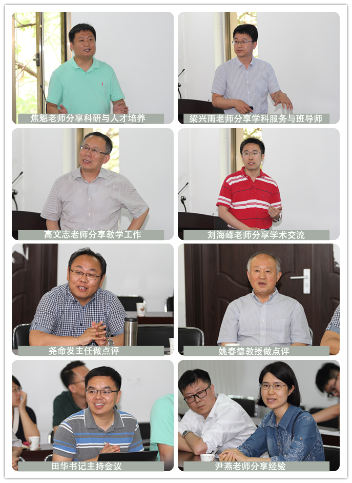 高文志与梁兴雨两位教授勉励青年教师做好教书育人工作。高文志强调:“大学要抓好‘培养人’这个根本,本科教学是教师的天职,希望支部继续营造爱热教学、善于教学的良好环境。”梁兴雨展示了自己做本科生班导师9年来细致入微的工作日志,分享了和“孩子们”一起成长的美好回忆。姚春德教授在交流环节表示:“把学生当成自己的孩子,把工作作为自己热爱的方向,就一定能做好。”
