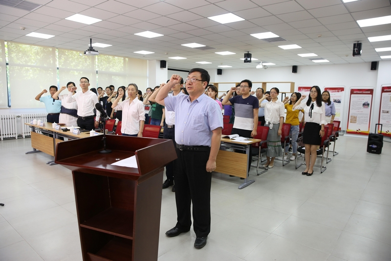 揭牌仪式后,学院党委书记王志带领机关党支部、学生工作党支部等各支部党员师生,面对党旗一起重温入党誓词。