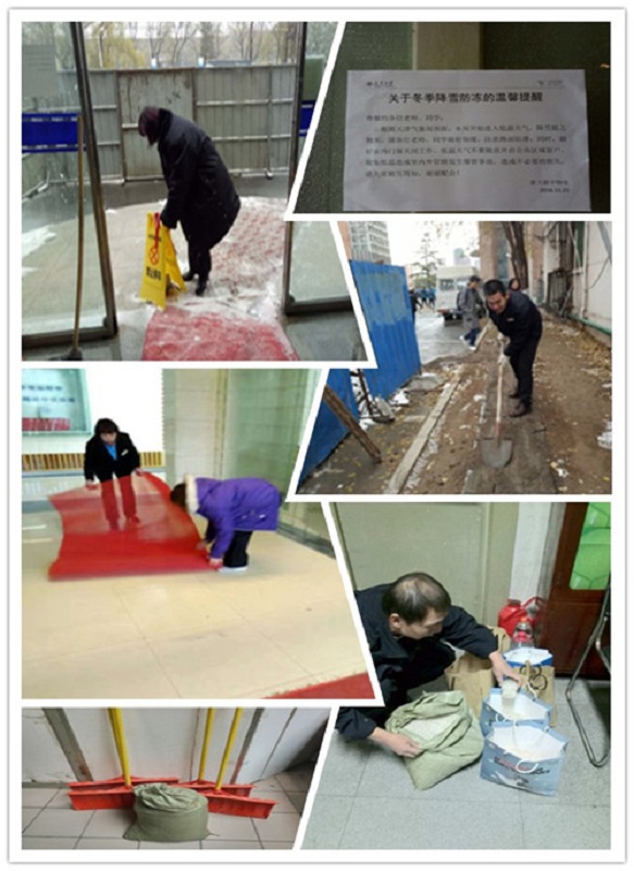 针对此次强降温降雪天气,物业监管科要求卫津路校区所有在校服务物业公司启动紧急预案,提前做好所辖区域内各项防范应对准备工作,包括配备竹扫、推雪板、铁锹、融雪剂等清雪用具;准备好防滑毯或防滑地垫、防滑提示牌;在楼宇明显位置张贴降雪防冻温馨提醒;巡视检查楼宇内和设备机房门窗、供暖设备,避免因低温造成管道冻裂跑水;对25、26号楼中央空调供暖机组设施设备进行检查,确保预定温度可达最佳。