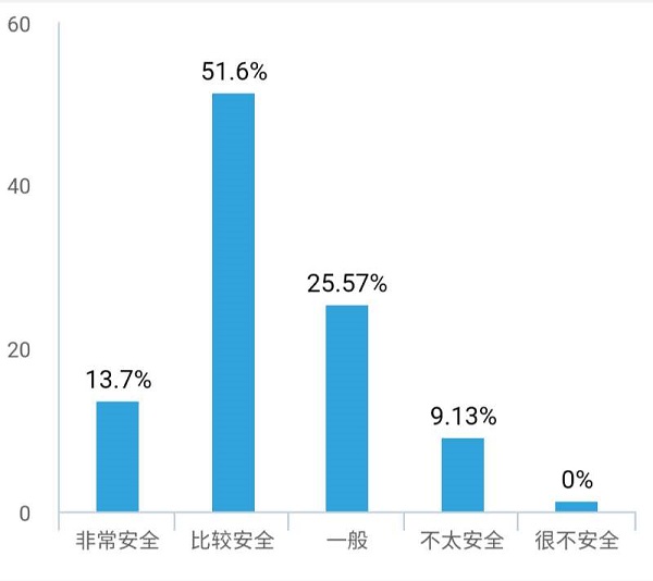 针对夜间在校园内出行是否安全这一问题,认为非常安全和比较安全的学生比例高达65.3%,只有9.13%的同学认为不太安全。参与调查的同学中,没有人认为夜间在校内出行很不安全。