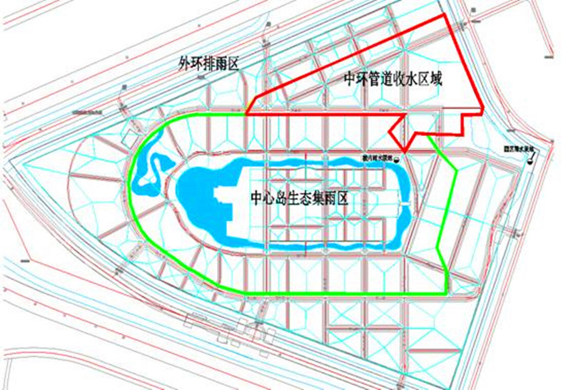 以北洋园校区为例,根据布局和功能,校园分为三个雨水排放分区,分别为外环自然排雨区、中环管道集雨区和中心岛生态调蓄区。