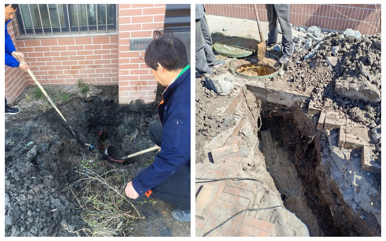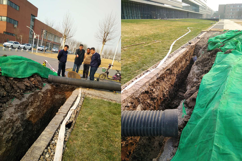 相似的问题也发生在图书馆西南处下水管道。经现场勘察,发现该处给水管道将污水波纹管压扁,所以导致下水管道多次堵塞。此前一直按常规方式清掏,也不能彻底疏通。为此,3月14日,施工人员开始动工挖土,挖深1.7m、长12m,更换三根波纹管,于3月22日将土填平、恢复原貌。至此,该处堵塞管道彻底疏通。