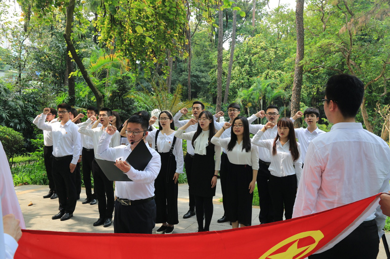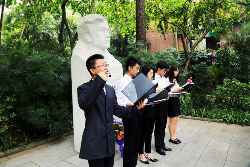 太雷班学员还自发组织了两场纪念缅怀活动。在广州起义烈士陵园,组织祭扫活动,缅怀烈士、祭奠英灵。活动中,太雷班代表向广州起义领导人塑像敬献花束,向广州起义纪念碑敬献花圈,并在张太雷烈士塑像前演绎原创作品《追忆太雷风骨,传承太雷精神》朗诵剧。校团委组织部部长谢圆圆与广州起义烈士陵园副主任唐庆坤分别代表双方单位签署了共建爱国主义教育基地的协议,为未来的红色革命教育合作奠定基础。在团一大广场,在庄严的团旗下,全体太雷班成员重温入团誓词,共唱团歌,朗诵原创作品《太雷诗》,缅怀先烈。