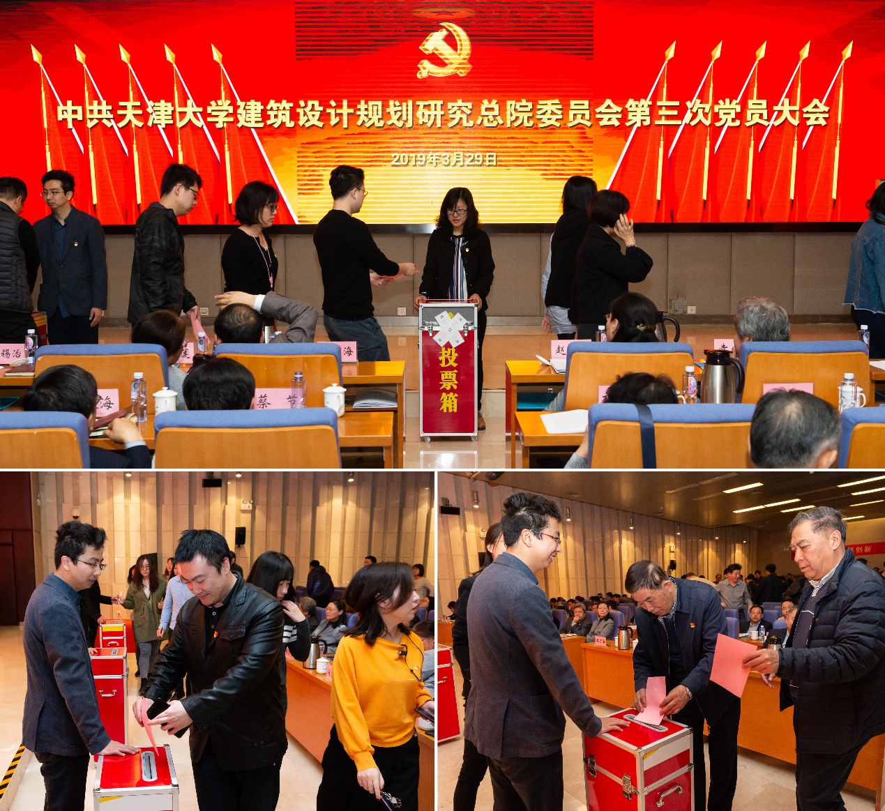 按照《中国共产党章程》和《中国共产党基层组织选举工作暂行条例》,采用无记名投票方式和差额选举的办法,大会选举产生中共天津大学建筑设计规划研究总院第三届委员会委员(以姓氏笔画为序):于庆雷、安海玉、李绍燕、张锡治、祝捷、袁大昌、贾莉、谌谦、程万海;中共天津大学建筑设计规划研究总院第一届纪律检查委员会委员(以姓氏笔画为序):于庆雷、于敬海、刘洪海、刘晓龙、胡振杰。