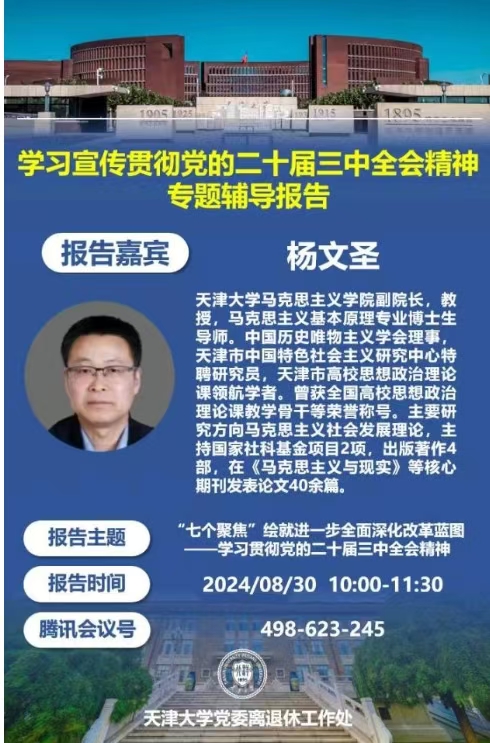 本站讯(通讯员 刘旸)为深入学习贯彻党的二十届三中全会精神,8月30日上午,党委离退休工作处举办学习贯彻党的二十届三中全会精神专题辅导报告会暨天津大学北洋老年大学2024年秋季首场思想政治理论课,邀请马克思主义学院副院长杨文圣老师作题为《“七个聚焦”绘就进一步全面深化改革蓝图——学习贯彻党的二十届三中全会精神》的辅导报告。校院两级关工委老同志,离退休党支部书记、支部委员和部分党员,北洋老年大学学员,党委离退休工作处全体工作人员和老年工作者共一百四十余人以及共建单位和平区委老干部局离退休干部八十余人参加了此次报告会。