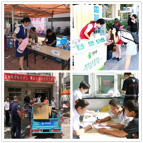 卫津路校区,物业在假期里就配合学校完成新生宿舍的粉刷、家具进场、配套设施安装的工作,提前做好工程检修、卫生清扫、窗帘清洗、接待人员培训等各项准备工作,营造舒适、整洁、干净的宿舍环境。迎新前期,物业监管部门就多次组织外包服务企业召开迎新工作会议,确保迎新工作各环节准备到位、有条不紊地进行。为学生宿舍发放卫生清洁工具,对宿舍各方面设施进行巡检、维修,确保新生入住品质。迎新当天,物业在学生公寓园区内摆放鲜花、张贴道路指引标识、悬挂横幅,营造了温馨、愉快的迎新氛围;设立了服务台并准备急救箱、饮用水和校园地图等;在公寓门口安排接待员的同时也安排了大量工作人员,为有需要的同学搬运行李,为新生和家长提供全方位的贴心服务。17教学楼精仪学院的物业工作人员主动找来三轮车一趟又一趟地帮新生和家长们搬运行李,细心周到的服务也感动了新生和家长,他们送上了表达谢意的小卡片,也是对物业工作的积极肯定。