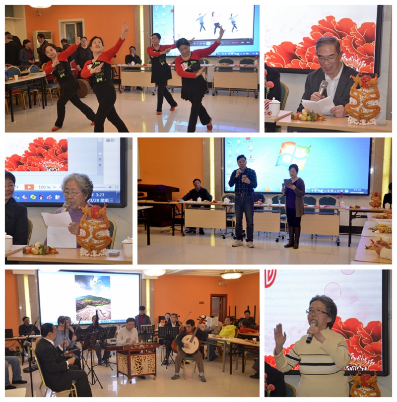 绘画组魏彩雯、桥牌组于思远、读书会赵桂英、形体组徐小敏等兴趣组代表介绍了组里活动内容情况和切身体会,展示了各自学习和活动的成果,表示了热烈欢迎新成员加盟的意愿。贾贵玺与潘家和为大家带来了精彩的诗朗诵,民乐队、形体组表演了精彩的节目。