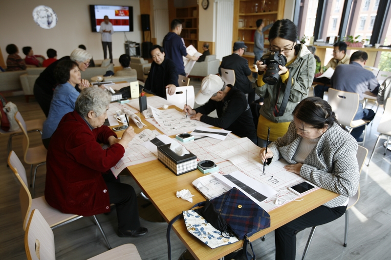 活动由书法老师为大家现场教学。在练习时间中,各位退休老教师纷纷跃跃欲试,有的笔体遒劲有力,有的笔体行云流水,一幅幅“砥砺奋进”、“为人民服务”等书法字幅抒发了笔者对于十八大以来国家人民学校奋发前进、取得傲人成绩的赞扬,同时也表达了对于十九大召开的由衷喜悦。