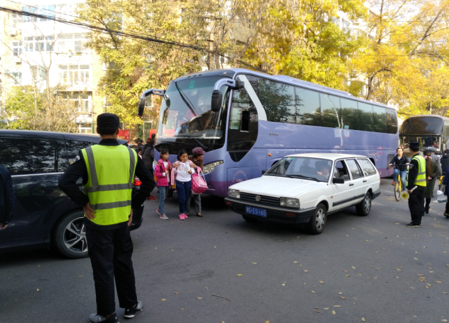 早晨7时20分许,附小师生在卫津路校区西门外湖滨道集结。由于正处在早高峰时段,接送师生的18辆大客车、上班的教职工车辆、停放在道路两侧的学生家长车辆……车水马龙,把湖滨道堵得水泄不通。门卫工作人员报告此事后,保卫处迅速抽调人力,在湖滨道沿线、西门入口、东门出口等重要节点加派人手,所有交通安保人员在10分钟内达到现场,疏导交通,确保接送师生的车辆、上班教职工的车辆都能顺利通行。在工作人员的疏导下,8时50分许,18辆大客车顺利从东门驶出。
