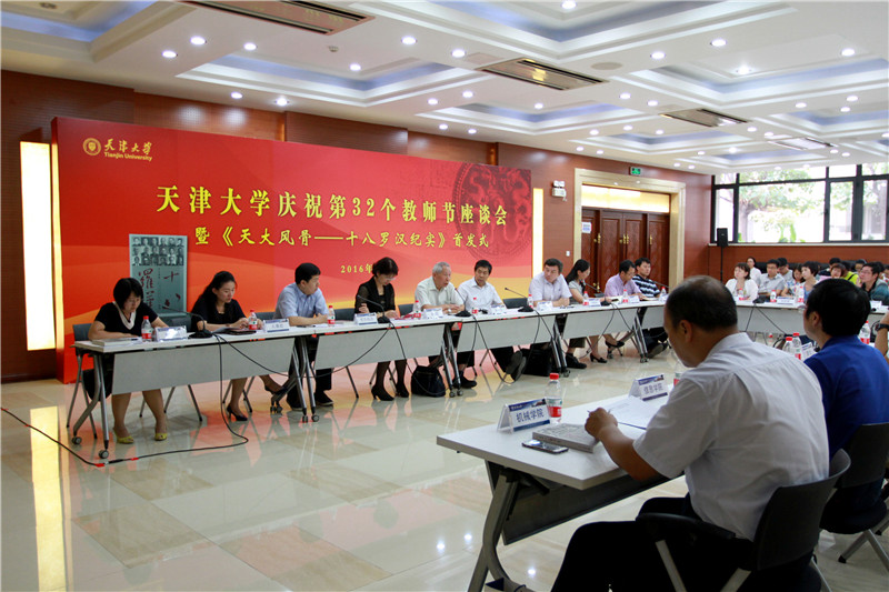 本站讯(记者 朱宝琳 摄影 赵习钧)9月9日下午,天津大学庆祝第32个教师节座谈会暨《天大风骨——十八罗汉纪实》首发式在卫津路校区科学图书馆一层报告厅隆重举行。会上发行的《天大风骨——十八罗汉纪实》一书是我校“师德立项工程”的成果之一,我校以此形式向学为人师、行为世范的老一辈教师致敬,并引导广大教师注重以德为先、德业双馨。