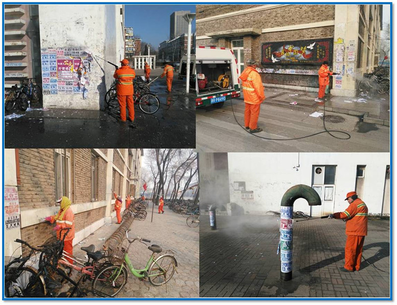由于学校附近商业密集,小广告遍及我校各个角落,严重破坏了整体环境,影响了我校形象。为将小广告彻底清理,校园环境管理中心借助校园环境卫生承包作业的契机自2016年2月份起承担了清理小广告的艰巨任务,在寒假期间调派了高压清洗车3部、环卫工20余人、扁铲铁刷等百余把,采取机械人工相结合的方式,经过十余天的努力,于2月15日已经将我校卫津路校区的小广告全部清理干净。在清理工作中,所有工人放弃了春节与家人团圆的假期,起早贪黑的忙碌在学校的各个角落,付出了艰辛的劳动,校长助理张力新及后勤保障部领导多次到一线进行慰问指导,极大的调动了工人们的热情。