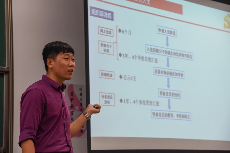 随后,靳学峰开始了化工学院2016级本科生第一节入党培训课。他对组织部和学工部两个发展流程做了详尽的介绍,规范了入党申请书和思想汇报的格式和写法,讲述了每个流程的细节,让同学们对入党流程有了更加深入的了解。靳学峰又着重强调了入党申请人党校考试的要求,提供了考试的复习方法和考核标准,鼓励同学们实事求是,严格遵守考试纪律。