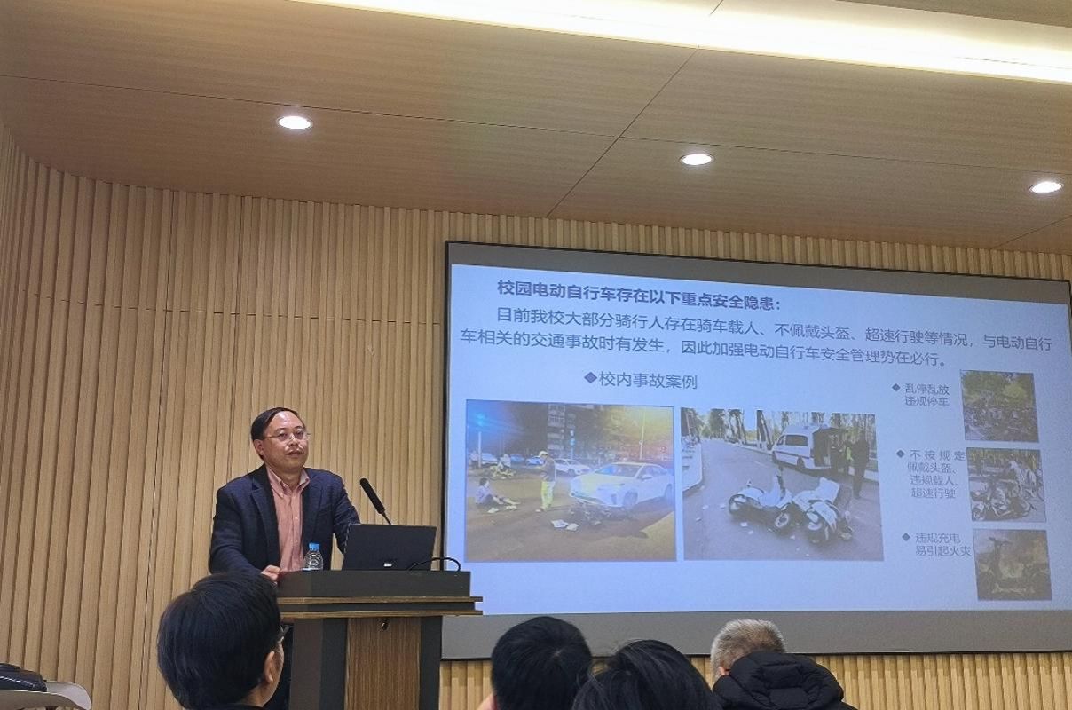 保卫处副处长刘东海聚焦校园安全关键领域,围绕消防与交通安全做报告,特别结合新修订的《天津大学消防安全管理办法》与新发布的《天津大学电动自行车管理办法(试行)》做政策宣讲和解读。