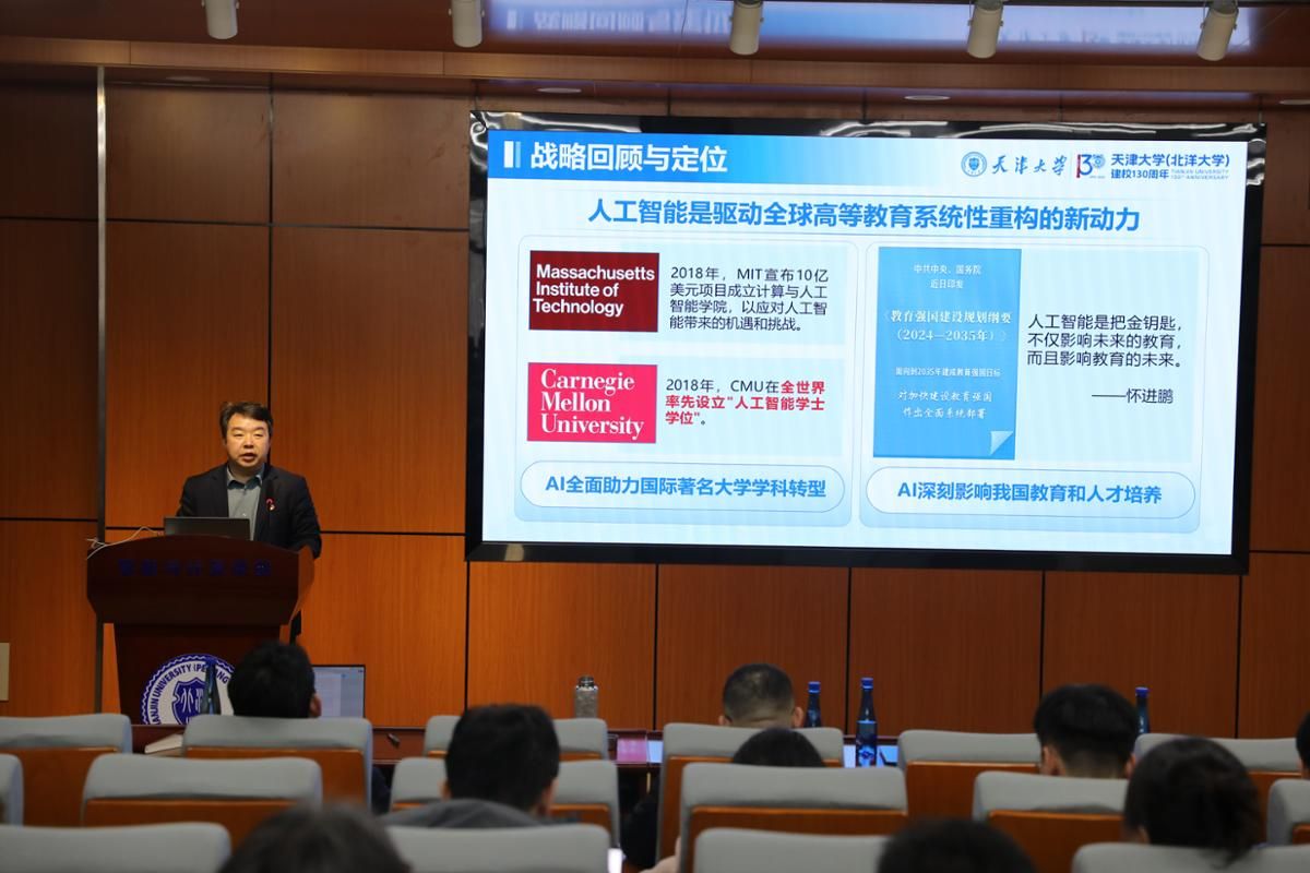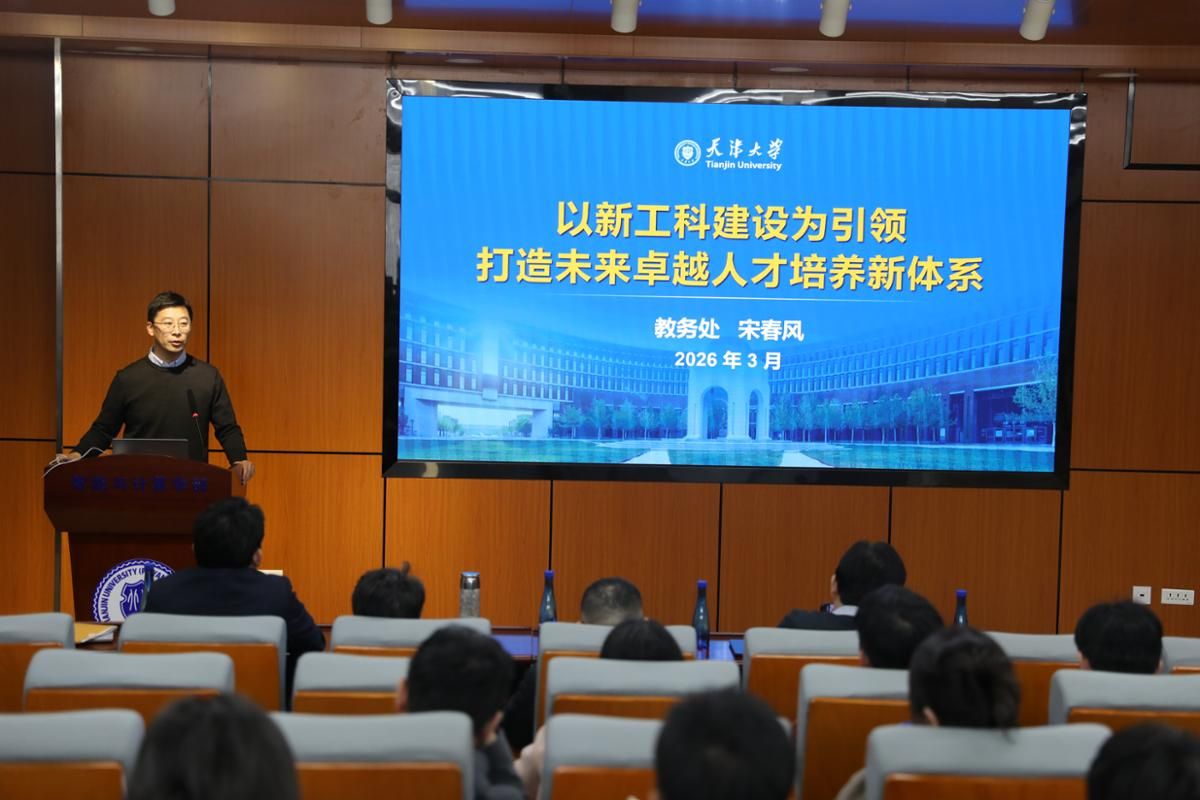 会议伊始,宋春风副处长为学院师生作题为《以新工科建设为引领,打造未来卓越人才培养新体系》的报告。他结合教育部相关要求和天津大学新工科建设3.0方案,阐述了新工科建设的内涵及人才培养路径,强调要推进教育、人才与产业、创新的深度融合,鼓励学院在校企协同和学科交叉中主动作为。此外,他还介绍了2026年学校在人才培养改革和教育教学方面的重点工作,特别是和人工智能相关的改革任务,为学院师生充分理解学校改革计划和任务提供了重要指导。