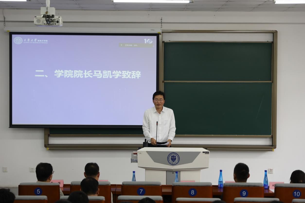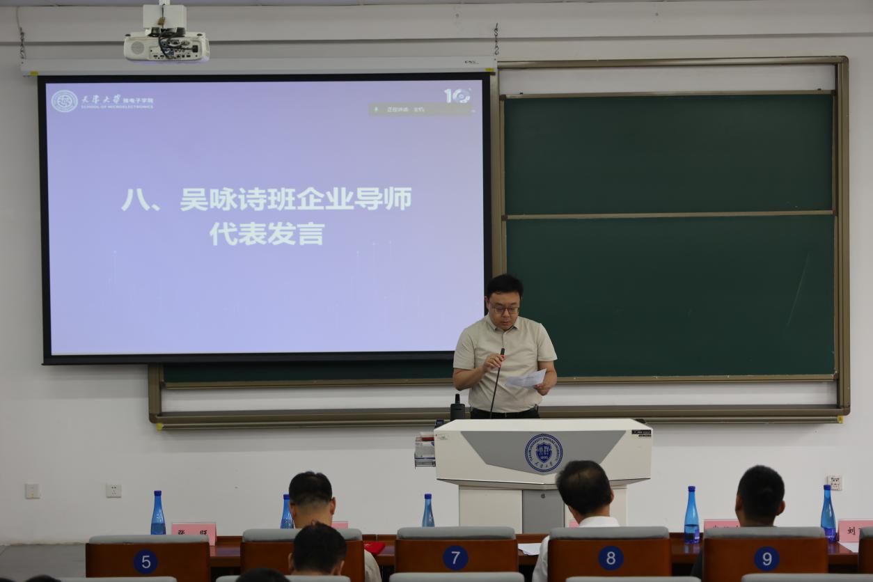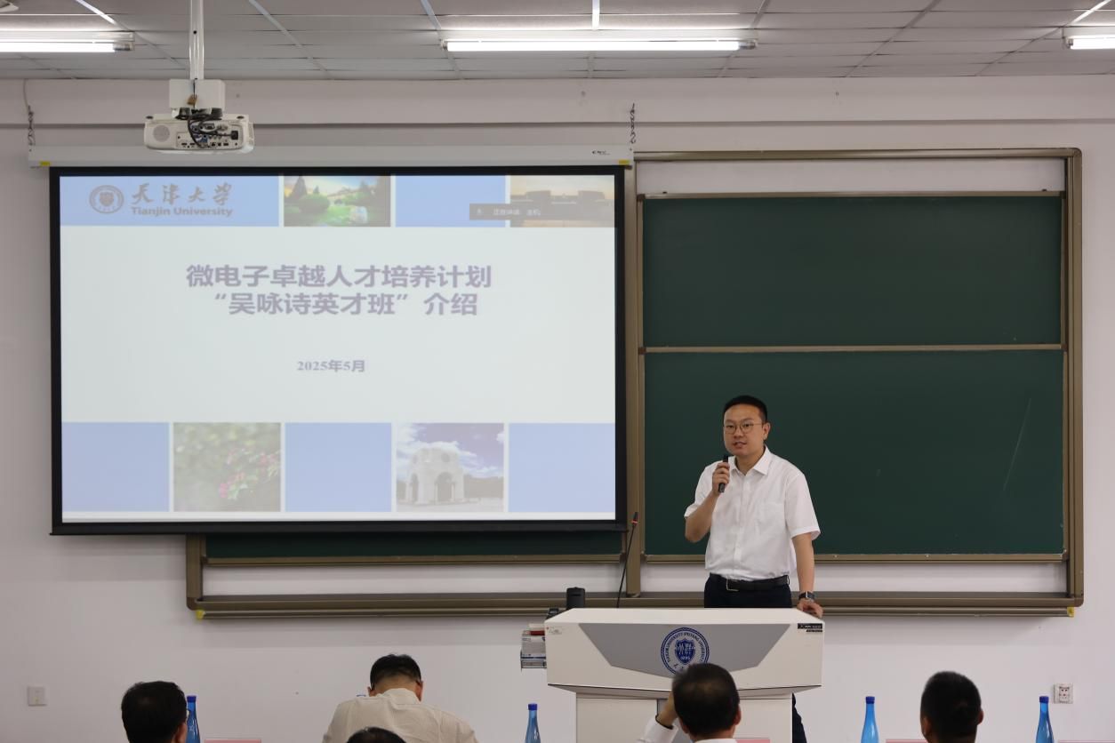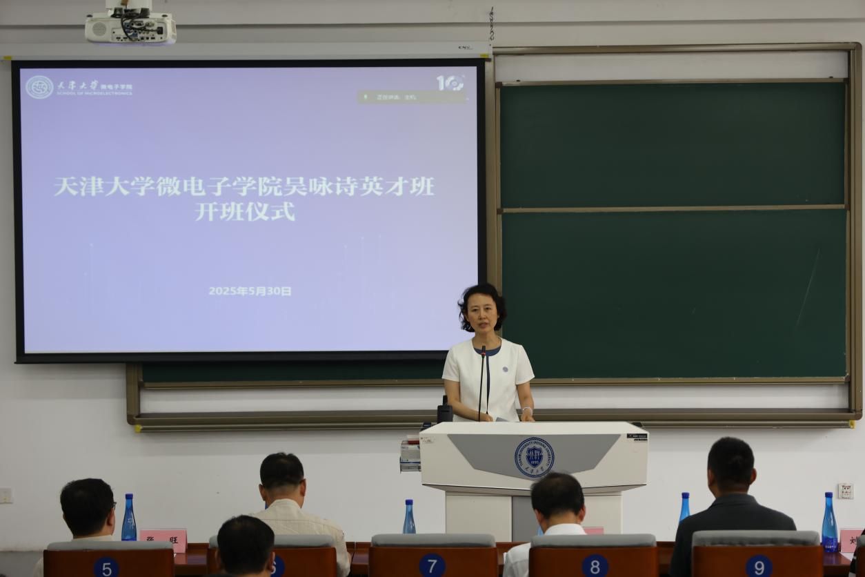 本站讯(通讯员:宋明璐、孙睿)5月30日下午,天津大学微电子学院2024级吴咏诗英才班开班仪式在卫津路校区23教108会议室隆重举行。吴咏诗校长女儿、澳门大学澳门研究中心客席教授吴玫,恩智浦半导体(天津)有限公司系统工程部总监邵鹏,飞腾信息技术有限公司科技管理部总监钱程东,中国汽车技术研究中心中汽数据有限公司高级主管、高级工程师张旺,天津大学教务处副处长刘丽萍,天津大学研究生院招生办科长李传波,微电子学院院长马凯学,微电子学院党委书记贾果欣,微电子学院副院长李卓,微电子学院副院长马永涛,学院教师代表,教务员,辅导员,朋辈导师以及2022、2023、2024级英才班全体成员出席本次开班仪式。仪式由微电子学院党委书记贾果欣主持。