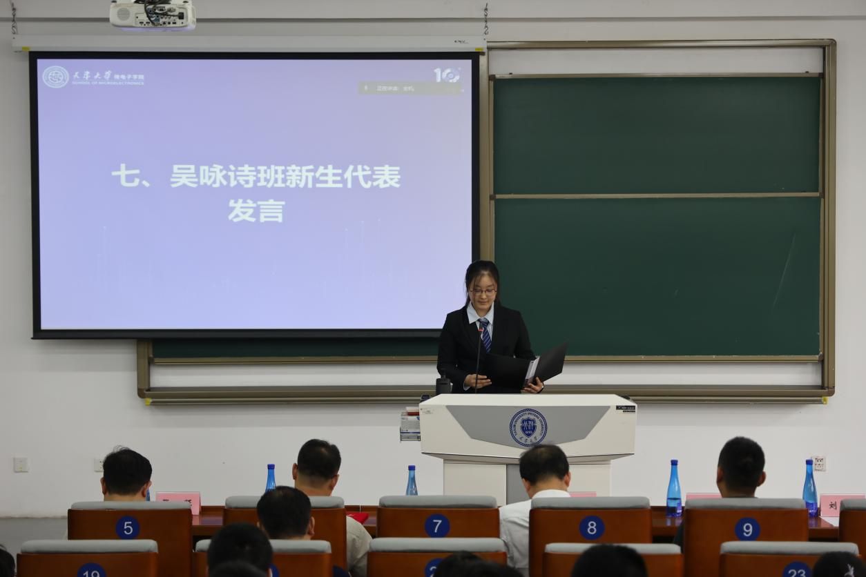 2024级吴咏诗英才班新生代表王欣蔚以“芯片上的星辰大海”为喻,描绘了投身微电子领域的理想蓝图。她表示,吴咏诗校长的“国家兴亡,匹夫有责”精神与学院“国家芯”的脉搏深深激励着自己,立志将个人理想融入科技报国征程。面对英才班这一“锤炼品格的熔炉”,她代表全体新生发出倡议:“以鸿鹄之志筑牢专业根基,以严谨治学追求卓越创新,以担当之心服务社会发展,用青春之笔书写‘强芯梦’答卷。”发言中,她特别提到天津大学130周年校庆与微电子学院建院10周年的历史节点,号召新生传承“兴学强国”使命,为“中国芯”事业接续奋斗。