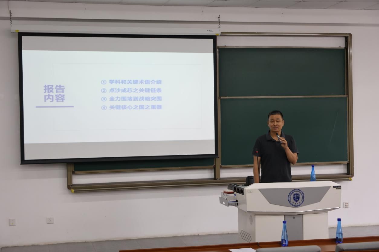 仪式后,飞腾信息技术有限公司科技管理部总监、高级工程师钱程东以《微处理器与芯片工业的一条求解道路》为题,为同学们带来一场兼具理论深度与行业洞见的精彩讲座。钱程东从“集成电路科学与工程”学科内涵切入,以“从沙子到芯片”为主线,生动解析芯片设计、制造、封装测试的全产业链条,揭开半导体工业的神秘面纱。他强调CPU作为算力核心器件在数字经济中的基石作用,并结合飞腾公司自主创新实践,展示国产芯片技术突破与产业应用成果。面对未来职业发展,他寄语同学:“夯实数理基础,关注交叉学科,保持终身学习,在‘卡脖子’领域找准发力点,做中国芯片产业的解题人。”讲座融合技术科普与职业规划,既有宏观产业视野,又贴近学生成长需求,为新生锚定专业方向、明晰使命担当注入强劲动力。