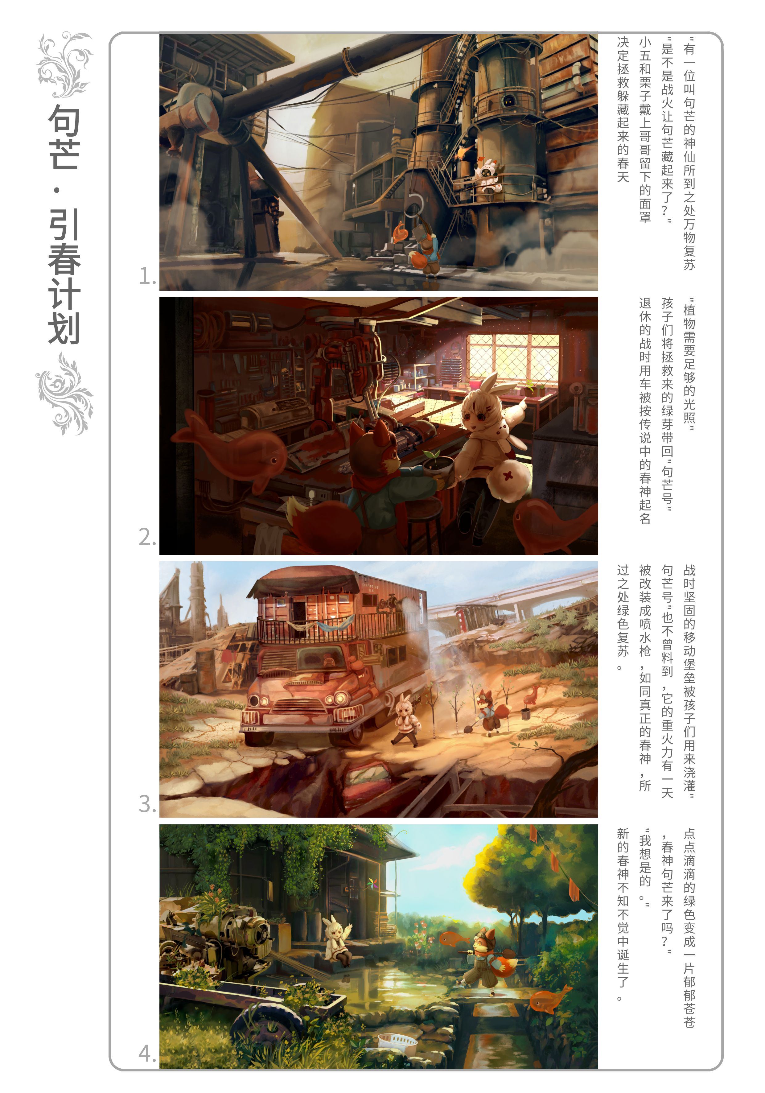 本组插画展现了:天灾人祸摧残后的末世下,两个小孩子穿梭于废弃的钢筋丛林之中,进行着他们称之为“句芒引春计划”的绿芽拯救行动,凭借自己的微薄之力将绿色带回荒芜的大地。孩子们的天真烂漫与顽强的生命力,在盎然的绿色中与残存的工业废墟形成鲜明对比。这幅画面传达了对和平生活的无限渴望,以及对自然之美和心灵之美必将延续下去的坚定信念。