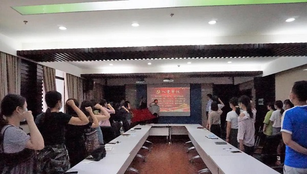 最后,在李一昂书记领誓下,全体与会党员面向党旗,举起右拳重温入党誓词。“我志愿加入中国共产党,拥护党的纲领,遵守党的章程……”铿锵有力的宣誓声,响彻会议室。
