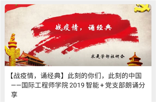 求是学部依托新媒体平台组织各学生党支部开展“战疫情,诵经典”系列活动,创新打造思想宣传阵地。分享抗疫期间先进事迹,彰显抗疫一线的的青春力量,弘扬“国家有需要,我们就上前”的志愿精神,传递“抗疫必胜”的温暖力量;进行诗词朗诵接龙活动,抑扬顿挫的声音中饱含着每一位中华儿女对奋斗在一线的医务工作者和基层工作者的感激之情,弘扬中华传统美德,加强新时代爱国主义教育;组织红色图书分享活动,挖掘红色资源,传承红色基因。