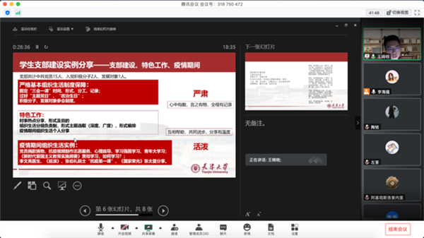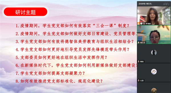 党支部书记的工作能力是学生党支部建设的保障。疫情期间,学生支部书记、支部委员在线上开展了以“提升学生党支部组织力,突出基层党组织政治功能”为主题的工作研讨会,结合疫情期间支部工作线上开展特点,探索工作新思路、新方法;利用线上组织生活开展特点,进行支部“云”共建,与华中科技大学环境学院党支部进行结对共建,分享抗疫期间学生党员的奋斗故事和新利18网址登录
