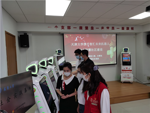 随后,焦璇为金狮家园社区、智慧未来科技有限公司授天津大学社会实践基地牌。社区工作者为求是学部学生党员孙雅正、姚晓雯讲解智能机器人的使用。