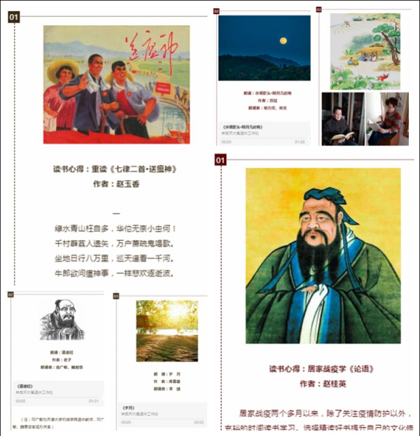 本次线上读书交流活动共分三期,展示了16位老同志的优秀作品。他们或推荐自己喜爱的经典书目,用精彩的文字记录下自己的体会心得;或与孙辈一起诵读经典作品,用妙趣横生的方式言传身教,树立良好家风。他们在此次活动中充分发挥了自身的政治优势、经验优势和威望优势,引导身边的家人亲朋树立正确的世界观、人生观、价值观,展现了天津大学离退休群体丰盈充实的灵魂世界和气象万千的精神品格。