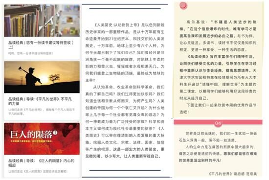 为引导学生多读书、读好书、读经典,深入探索研究创新,不断提升思想修养和科学人文素质,校团委依托线上媒体,创新活动形式,拓展学生沟通渠道。发挥品牌效应,开设“团校陪你云读书—‘书’写青春,‘声’援抗疫”专题栏目,于每周五与大家分享一本主题好书,针对书中热点话题,利用栏目加强与读者的互动。碰撞思想火花,开展线上读书分享会,组织不同学科学员5人组成读书小组开展读书活动,发挥学科思维方式差异化优势,倡导朋辈教育模式,实现对团校学员的思想引领。丰富展现形式,鼓励学生利用特长,通过制作图书海报、担任朗读者、分享配音秀等方式展现读书成果,将读书成果辐射得更广。倡导阅读新风尚,以世界阅读日为契机,开展“书行万里”活动,通过搜集读者信息,汇集成书籍地图,让学生开展一场精神旅行,在书籍的海洋中遨游。