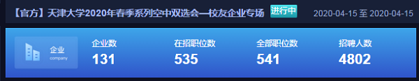 本次双选会是天津大学举办的系列双选会之一,旨在凝聚校友力量,做好就业信息开源,共渡疫情难关,为2020届毕业生平稳顺利就业创造平台,实现更高质量的就业。据悉,就业指导中心四月份还将举办南开大学&天津大学联合招聘会等多场空中双选会。