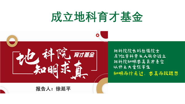 党委书记徐延平和院长助理李晓东分别介绍了新成立的地科院知明求真育才基金和新设立的地理科学本科专业建设情况,求是创新,向地科五周年献礼。