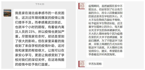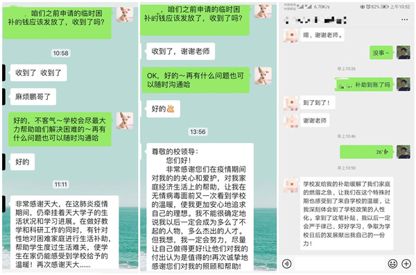 临时困补,暖心支持。学校为每一位身在湖北地区的家庭经济困难学生定制个性化资助方案,全覆盖发放1000-2000元补助金。重点筛查学生个人或家人确诊为新冠肺炎患者的家庭经济情况,及时发放临时困补。其他地区学生因疫情造成临时生活困难并亟需帮助的学生,随时向学校申请补助,学校第一时间审核发放,资助金额500-2000元不等。针对家庭所在区域不具备安装满足在线课程学习宽带网络的条件、需通过手机流量在线学习的家庭经济困难学生,发放200元学习流量补贴。目前,已面向全校近500名学生发放各类补助30余万元。
