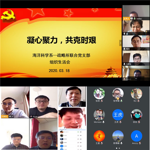 本站讯(通讯员 王悦媛 张婷婷)在疫情防控工作的特殊时期,为深入贯彻习近平总书记关于疫情防控工作的重要讲话、重要指示精神,充分发挥基层党组织的战斗堡垒作用和广大党员的先锋模范作用,继续落实好“不忘初心、牢记使命”主题教育制度化、常态化要求,根据校、院党委相关规定和要求,海洋学院各基层党支部纷纷开展专题线上组织生活,坚持理论学习不放松、组织生活不断线,坚决打赢新冠肺炎疫情阻击战。