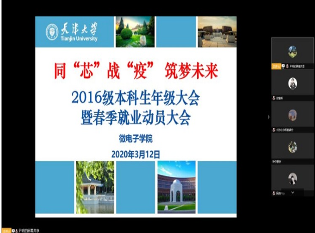 本站讯(通讯员 尹明)在抗击新冠肺炎疫情的关键时期,克服疫情影响,做好疫情防控和毕业生毕业、就业相关工作责任重大。3月12日上午,微电子学院召开以“同‘芯’战‘疫’筑梦未来”为主题2016级本科生年级大会暨春季就业动员大会,学院党委副书记韩旭和2016级全体本科生参加会议。会议由学院2016级本科生辅导员尹明主持。