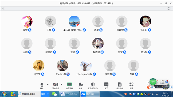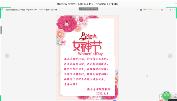 本站讯(通讯员 赵雪)2020年的“三八”国际妇女节翩然而至,由于当前国家正值新冠肺炎疫情防控关键时刻,为给全院女教工过一个既安全又有意义的节日,微电子学院工会依托互联网,于3月8日下午举办了线上庆祝活动,学院十七位女教工参加本次活动,活动由工会副主席肖夏老师主持。