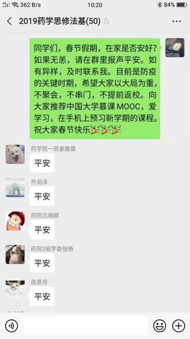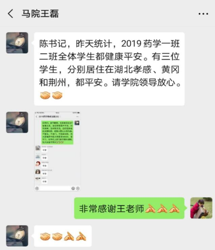 马克思主义学院王磊老师是药学院2019级思政班主任。他在得知疫情的第一时间,立刻想到了自己班级的47名药学生。“他们现在都在哪?他们都安全吗?”王老师马上通过班级微信群排查学生所在地,掌握班级健康数据,及时上报。“同学们,春节假期,在家是否安好?如果无恙,请在群里报声平安。如有异样,请及时联系我。”班级学生纷纷在群里反馈。一声声“平安”,一句句“谢谢老师”,同学们的平安就是班主任老师最大的期盼。