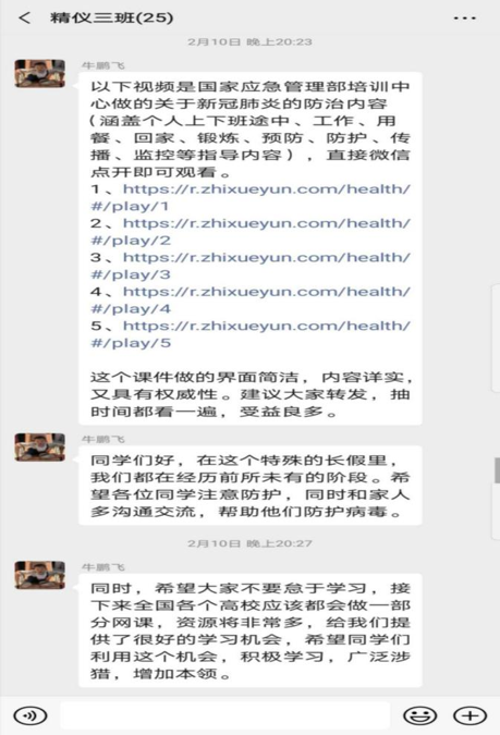 在关心同学们身体健康之余,精仪学院班主任牛鹏飞老师还定期整理汇总关于新冠肺炎的科学防治资料,上传到班级群中,指导学生不信谣,不恐慌,科学认识,合理防控。