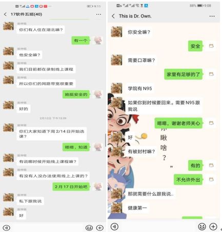 智算学部2017级软件工程5班的王思琪同学放假后返回湖北老家过年。疫情爆发后,她收到了班主任老师翁仲铭的无微不至的关心。翁老师询问王思琦的身体状况和家庭情况,并主动提出为她提供口罩等防疫物资,嘱咐她健康第一。王思琦说:“我特别感动,尤其是翁老师留意到湖北物资短缺,问我需要口罩吗,他可以寄给我的时候,我感到翁老师是发自内心地关心我!”除了王思琦,翁老师也留意着班级每个学生的健康状况。同学们表示,翁老师的温暖也让我们感受到了来自学部的关爱,虽然大家分散在祖国各地,但我们的心始终相连。