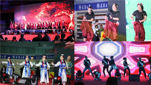 晚会在马来西亚留学生气势磅礴的二十四节令鼓《新年的祝福》中拉开了帷幕。来自约旦、哈萨克斯坦、尼日利亚和中国的四位大学生主持人分别用母语问候了全场的观众。整场晚会由三个篇章25个节目组成。第一篇章“多元文化交汇融合”中,来自朝鲜、蒙古、也门、莫桑比克、萨摩亚、缅甸、巴基斯坦、瓦努阿图的留学生们载歌载舞,将各国的风土人情淋漓尽致地展现在观众的面前。第二篇章“我爱中国我爱天大”中,留学生们以小品、诗朗诵、歌舞等多种形式抒发了自己对天大、对中国炽烈而深厚的情感。其中小品《CSC学生的一天》幽默生动地还原了预科生的学习生活,引发了台下观众的阵阵笑声。津巴布韦留学生玛丽温柔而细腻的诗朗诵,完美的演绎了《再别康桥》依依惜别的深情。第三篇章“五洲同庆四海一家”里,来自五大洲的青年学子们用歌声汇聚欢乐,用舞蹈展示青春风采,曾在天津大学举办男高音独唱音乐会的喀麦隆留学生乔治和莫桑比克留学生安吉拉共同演唱的歌曲《shallow》更是将晚会的气氛推向高潮。以新年联欢会为契机,各国的留学生们抒发自己对中国的情感,编织自己关于中国的梦想,用才艺诠释对中国文化的认知与欣赏,满怀喜悦迎接崭新的一年。