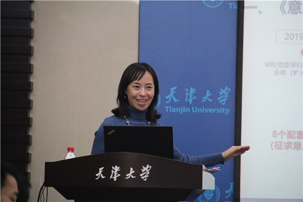 吕静就《天津大学关于落实“立德树人”根本任务推动“三全育人”“五育并举”人才培养综合改革的意见》出台的过程、基本框架、主要内容进行了详细的解读,特别就“德育铸魂计划、智育固本计划、体育强健计划、美育浸润计划、劳动教育淬炼计划”以及“强化全员育人责任、转好全过程育人环节、营造全方位育人环境”做了详细的说明,并希望与学院教师充分交流研讨,希望老师们多提出意见建议。