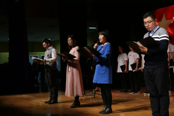 “我爱你中国,爱你青年人的热情奔放,爱你战国编钟走出的古典,爱你奥运史上零的突破……”理学院党委副书记王作金带领学院教师秦珠、商闯、赵鹏,以诗歌朗诵《我爱你,中国》,将晚会的序幕缓缓拉开。