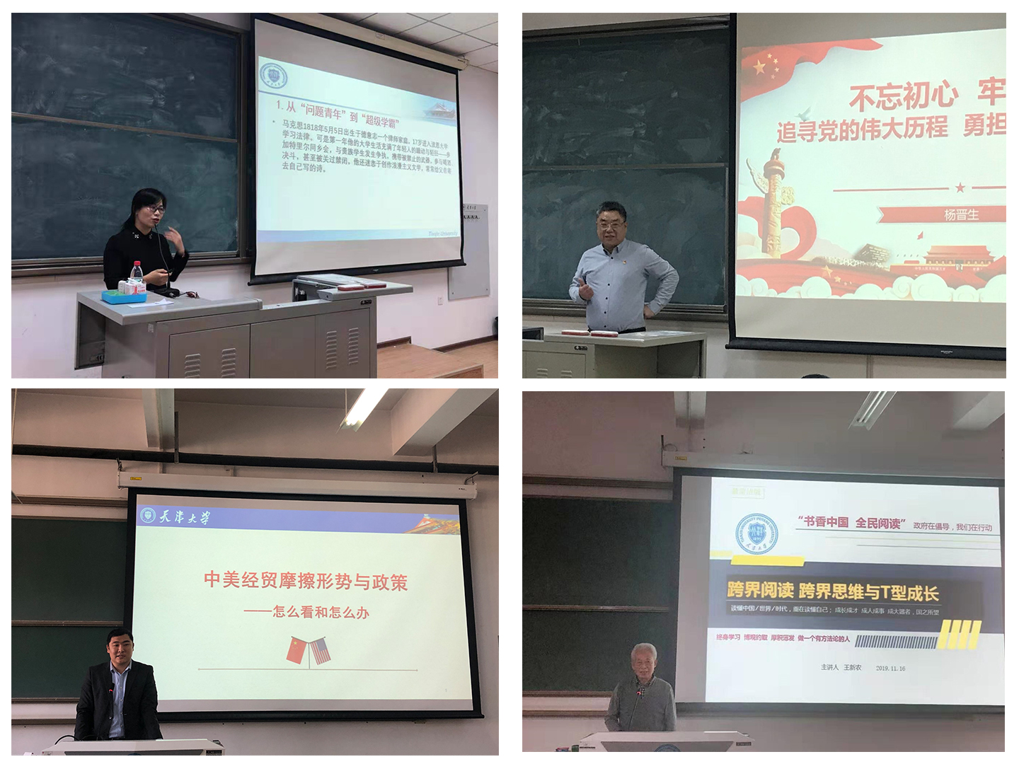11月3日上午,屈婷在12教401为党员们讲授第一节专题党课——“为什么信仰马克思主义“。屈婷老师通过马克思的生平结合中国特色社会主义理论,开阔了同学的视野,帮助大家更好的理解了中国特色社会主义理论。11月3日下午在12教401,杨晋生为学生党员讲授第二节专题党课——“追寻党的伟大历程,勇担新时代青年的责任”,杨书记回溯中国共产党的伟大历史,通过党的指导思想的不断丰富发展,结合今日之青年的责任与使命,生动的讲述了一个新时代青年应该有的胸怀与视野,让同学们对党的指导思想和党的伟大历史有了更深入的了解。11月10日下午在26教A409,韩旭为学生党员讲授第三堂专题党课——“形势与政策:中美贸易摩擦”。韩旭老师以精准的话语向同学们剖析了中美大国关系的前世今生,让同学们更深入的理解了中美贸易摩擦的原因、经过与影响,使得学生党员在国际形势中深刻理解青年学子的责任担当。11月16日上午,王新农老师在26教A103为本期党员集中理论培训讲授最后一堂专题党课——“结合天大品格谈跨界阅读、跨界思维、跨界成长”。王新农强调跨界阅读跨界思维的重要性,并结合天大品格,引导广大学生党员要学会用科学武装头脑,用人文滋养心灵,为学生党员们在接下来的学习新利18网址登录