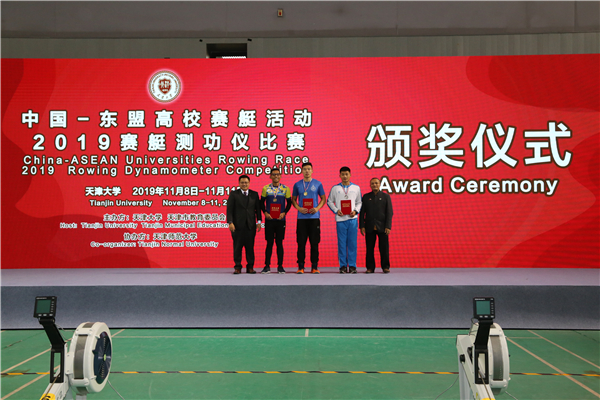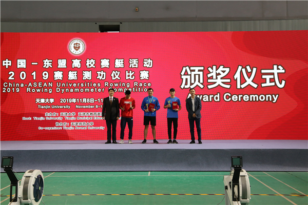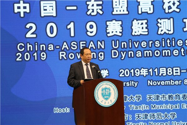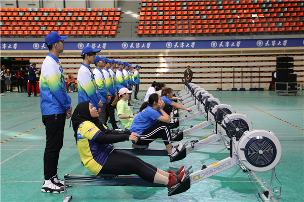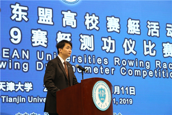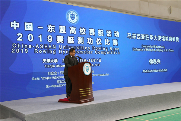 本站讯(通讯员 靳楠)体验赛艇文化,感受健康运动,拓展体育友谊。日前,中国—东盟高校赛艇活动暨2019赛艇测功仪比赛在天津大学体育馆成功开幕。本届赛事共吸引来自国内外7所高校11支队伍100余名运动员参加。中国教育部中外人文交流中心副主任杨晓春,马来西亚驻华大使馆参赞侯春兴,印度尼西亚驻华大使馆教育专员Yaya Sutarya,天津市学生赛艇联盟负责人、原天津市政府副秘书长沈家聪,天津市教委体美劳处处长张华泉,天津大学副校长巩金龙出席开幕仪式,天津大学有关学院领导以及全体裁判员、运动员、赛事志愿者共同参加了开幕仪式。杨晓春、侯春兴、巩金龙分别为大赛致辞,开幕仪式由天津大学国际合作与交流处处长张振主持。