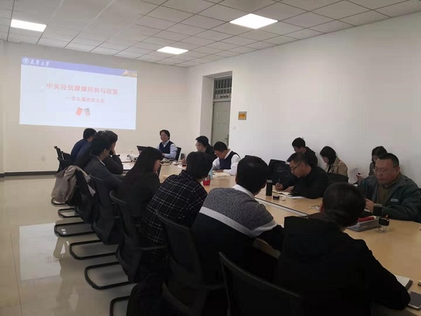 本站讯(通讯员 寇伟元)10月28日,区域发展研究院(以下简称区域院)党工委开展“不忘初心、牢记使命”主题教育专题党课,党工委书记王寒做了题为《中美经贸摩擦形势与政策——怎么看和怎么办》的报告。学校“不忘初心、牢记使命”主题教育第六督导组组长王刚、李晶,区域院院长杨明海、副书记、副院长王春玲、副院长林漫群、副院长谢继勇、副院长宋叙言及区域院机关党支部、滨海院教工党支部、武清院教工党支部共20余名党员聆听报告。