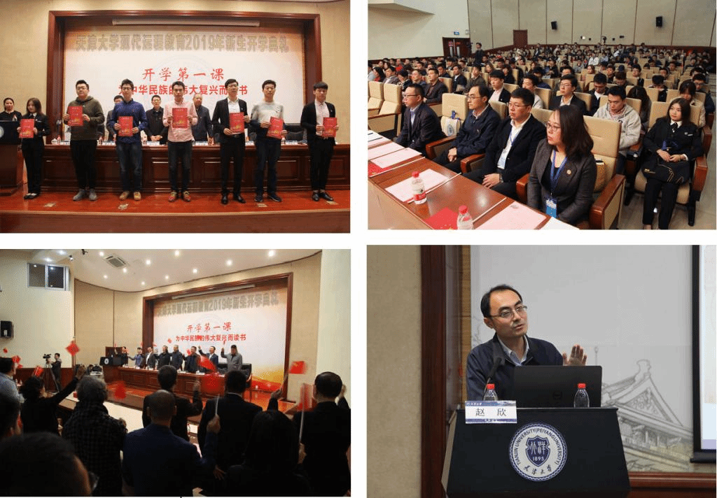 典礼第二阶段,新生们聆听了天津大学党委学生工作部部长、学生处处长赵欣老师以《为中华民族的伟大复兴而读书》为主题的开学第一课。课程从青年时代的“为了中华之崛起”而读书为序,引导2019级新生以正确的方式开启大学生活。通过近代中国历史与西方的关系,对比到今天新时代中国特色社会主义思想指引下的强大起来的中国与世界各国的关系,以及在国际舞台上所拥有的更高站位,指出当今中国的变化日新月异,人才至关重要,而优秀人才离不开教育,建设教育强国是中华民族伟大复兴基础工程。天大就是培养人才的地方,就是教育的高等学府。