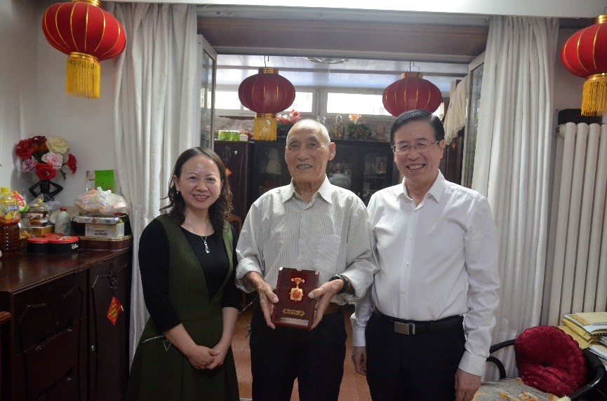 李家俊向刘振昌转达了党中央、天津市委和学校党委的亲切问候,为其颁发了庆祝新中国成立70周年纪念章。李家俊说,党和国家始终没有忘记老一辈革命家和新中国的建设者为祖国的繁荣强大做出的卓越贡献,这沉甸甸的纪念章就是功勋的最好证明,感谢刘老这一生为国家,为人民,为学校做出的突出贡献,祝愿其身体健康,平安幸福。李家俊同时谈到目前正在全校范围内开展的“不忘初心、牢记使命”主题教育,也就相关调研问题听取老同志们的意见。