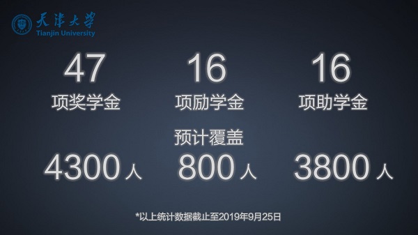 据悉,截止2019年9月25日,国家、社会各界、爱心校友和个人共在天津大学设立奖助学金79项,其中奖学金47项,励学金16项,助学金16项,总金额达3640万元。预计将有4300余名学生获得奖学金,800余名家庭经济困难学生获得励学金,3800余名家庭经济困难学生获得助学金。奖学金和励学金中最高奖励额度为3万元/人/年,助学金中最高资助额度为1.5万元/人/年,资助覆盖率将达到100%。