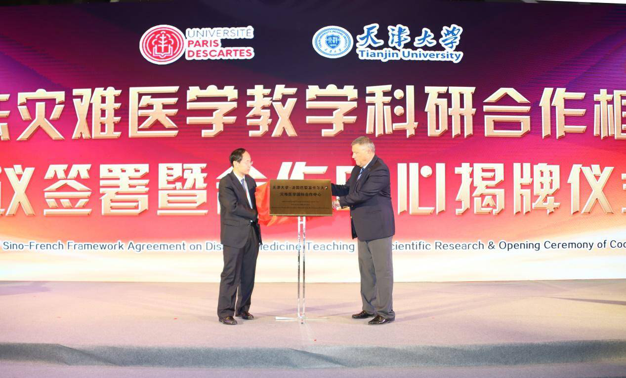 合作中心”成立揭牌仪式。法国笛卡尔大学灾难医学系主任、法国巴黎院前急救(SAMU)中心主任Pierre Carli教授与天津大学灾难医学研究院院长侯世科共同为“中法灾难医学教学新利18网址登录
